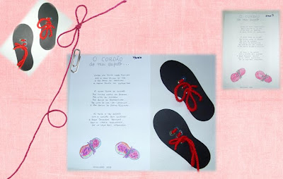 Os nossos sapatos foram feitos em cartolina… fizemos uns furos, pintámos cada furo de acordo com a lengalenga e depois de algumas tentativas lá conseguimos enfiar os atacadores e dar os laços.